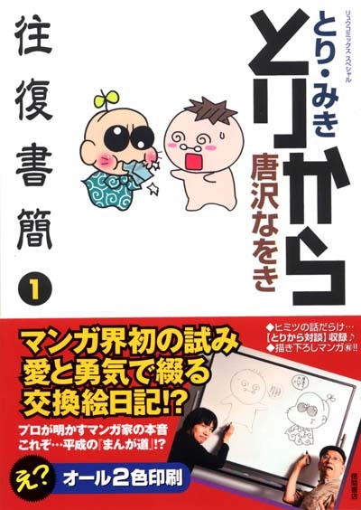 合作漫画は、過去、しりあがり先生とか、水玉先生とか、永野先生とか、いろいろスゴイな先生とやらせてもらってるんですが、とおとお、というか、よりによって、というか、オレの師匠であるとり先生と、しかも単行本まるまる一冊。おっかなびっくり始めた漫画ですけど、ちゃんと面白いんだ、これが!!